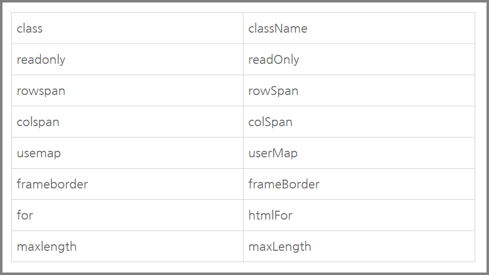 자바스크립트의 이름 규칙 때문에 실제 html 속성의 이름과 다른 이름을 갖는 경우가 있습니다.