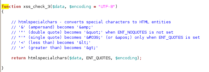 xss_check_3는 htmlspecialchars 함수를 사용하고 이것은 PHP에서 제공하는 기본 함수입니다.