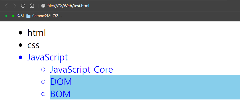 파란색으로 변경한 후에 li 엘리먼트만을 조회해서 배경색을 하늘색으로 지정하고 있습니다.