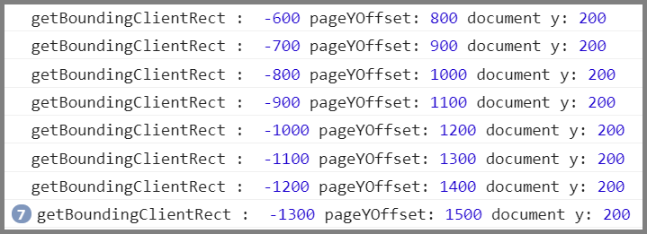 스크롤을 계속 내려도 200이라는 문서 좌표가 출력되는 것을 알 수 있습니다.