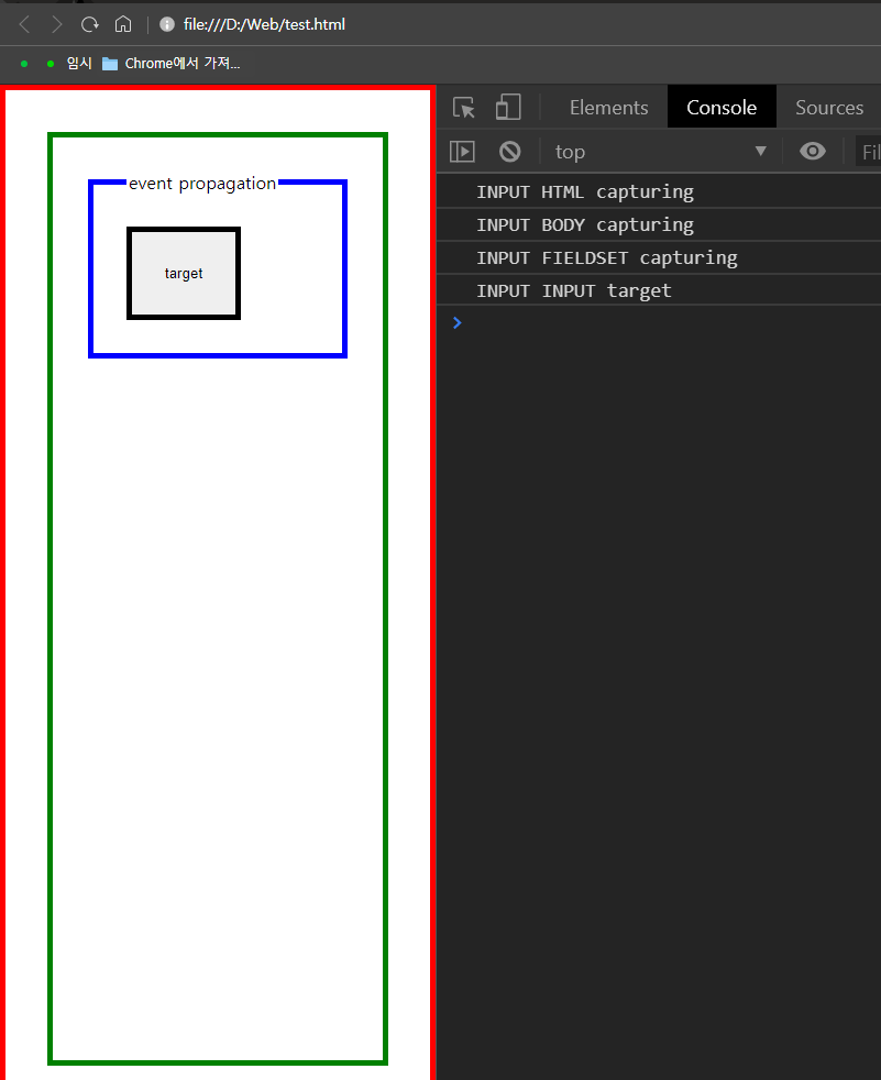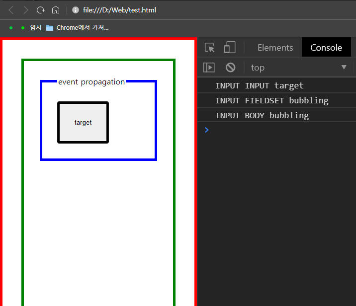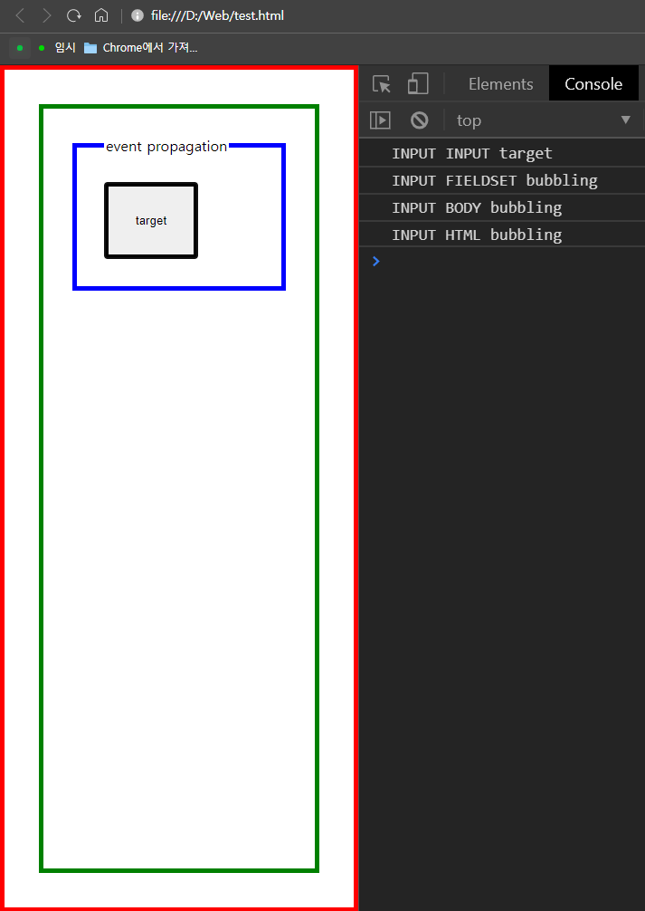 이럴때 중첩된 태그들의 이벤트는 어떻게 처리가 되어 출력이 되는지 보겠습니다.