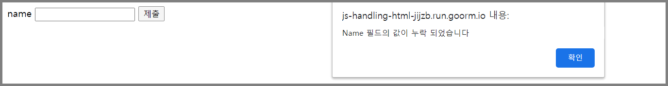 위 그림과 같이 Name 필드의 값이 누락되었다는 메시지와 함께 submit 이 중단됩니다.