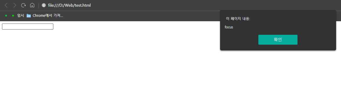 input 태그를 클릭하면 아래 그림과 같이 focus 라는 경고창이 출력됩니다.