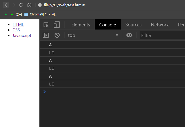 ul 엘리먼트의 하위 엘리먼트 중에서 a, li 엘리먼트들에 대해서만 이벤트가 발생합니다.