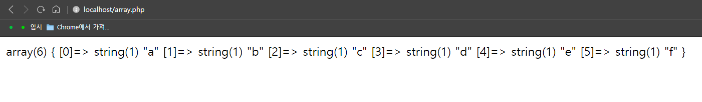실행결과 배열 array_test 는 a, b, c, d, e, f가 됩니다.