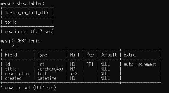 그 후 topic이라는 table을 생성한후 각각의 값들은 위와같이 설정해주었습니다.