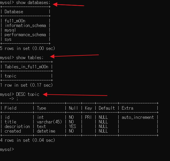 성공적으로 database와 table 를 생성했습니다.
