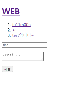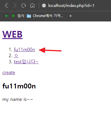또한 "create" 를 누르게 되면 index.php 페이지에서 create.php가 출력됩니다.