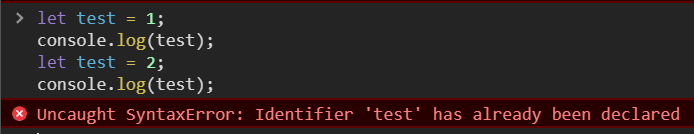 let 변수는 var 변수와 다르게 재선언이 되지 않습니다.