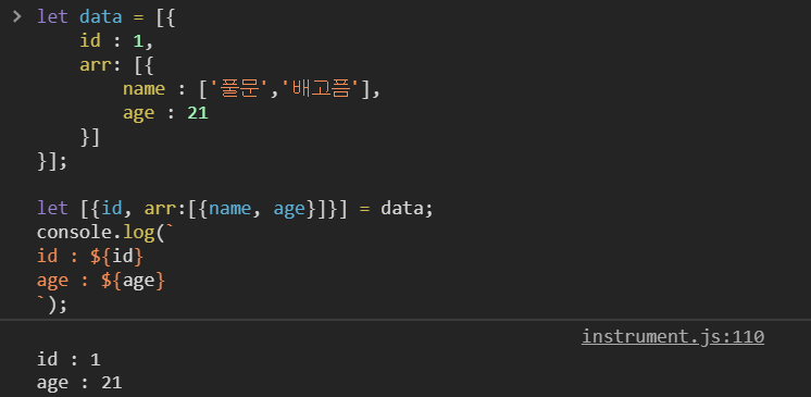 destructuring 을 사용하면 json 형식의 객체나 배열을 쉽게 변수에 할당할 수 있습니다.
