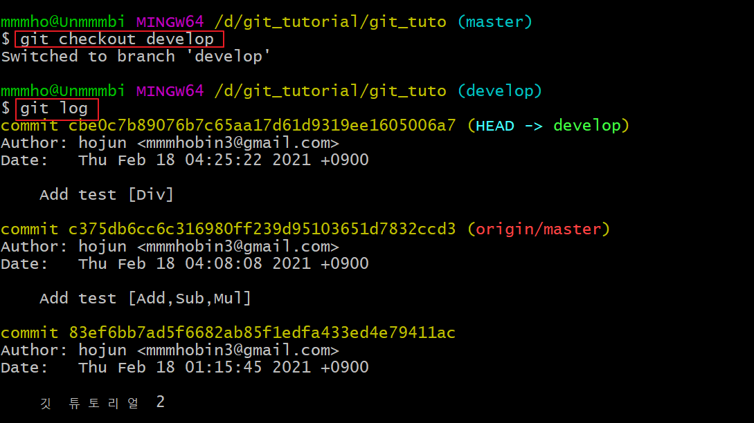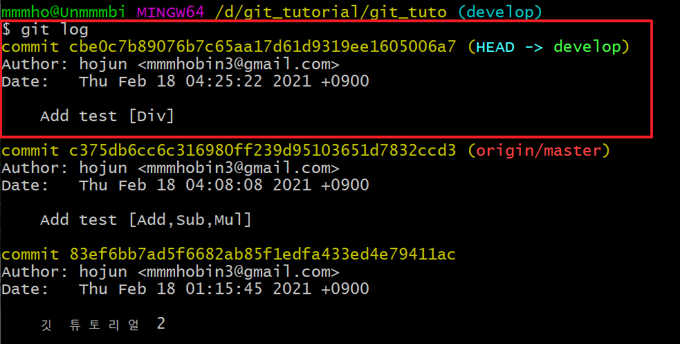 git log를 확인해보면 develop 브랜치에 정상적으로 함수가 추가되었고