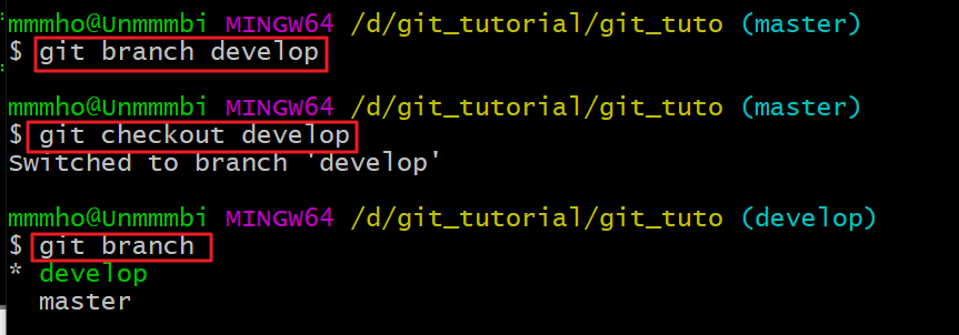과정을 살펴보기 위해 develop 브랜치를 생성해준 후 이 브랜치를 가리키게 해 보겠습니다.