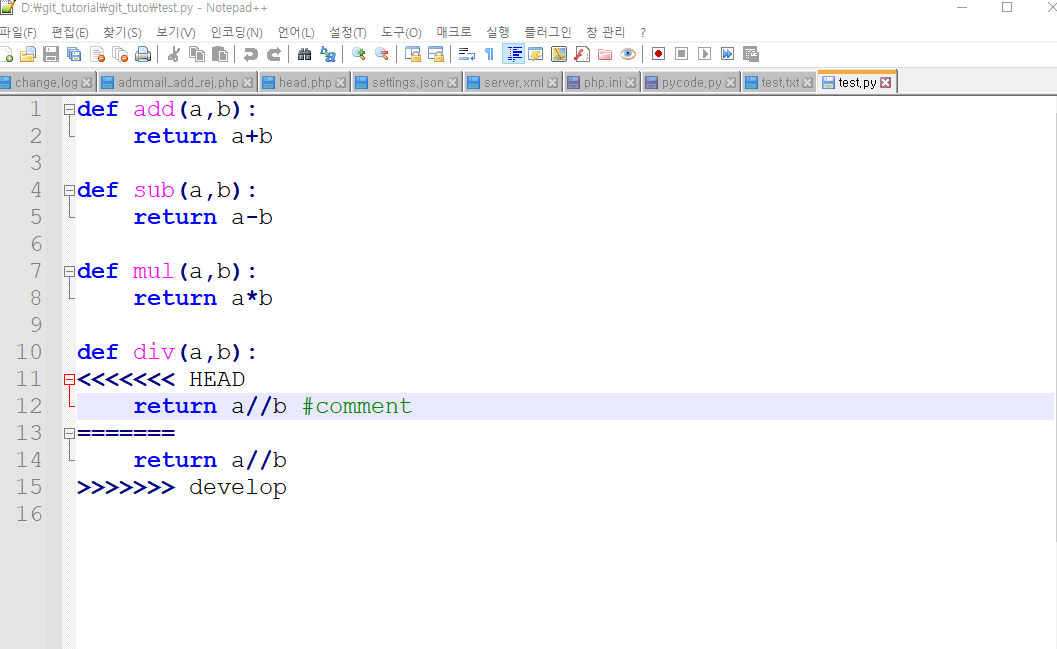 이제 내 test.py를 열어보면 자동으로 깃에서 소스코드가 다른 부분을 명시해주고 있습니다.