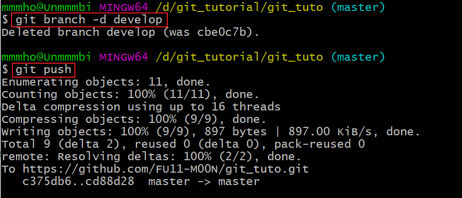 로그를 살펴보면, 이미 마스터 브랜치와 develop브랜치가 병합되어 한 화면에 같이 나오게 됩니다.