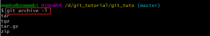 git archive -l 명령을 입력하면 achive가 지원하는 포맷 형식이 출력되는 걸 볼 수 있습니다.