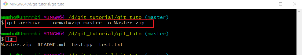 위와 같이 git archive 명령어로 포멧 형식을 zip으로 지정해주고,