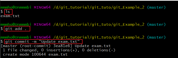 그리고 exam.txt 라는 파일을 하나 만들고 add 하고 commit 해줍니다.