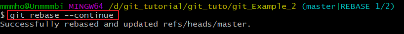 이후 rebase 명령어에 continue 옵션을 붙여서 변경된 내역을 반영하겠다고 넣어주면 성공적으로 완전히 반영이 됩니다.