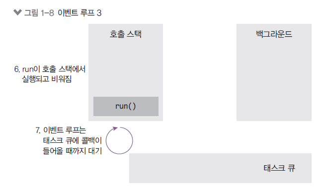 백그라운드: 타이머나 I/O 작업 콜백, 이벤트 리스너들이 대기하는 공간. 여러 작업이 동시에 실행될 수 있습니다.