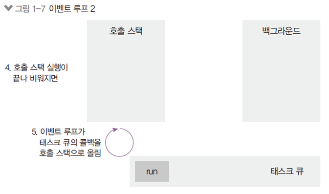 이벤트 루프는 태스크 큐에 다음 함수가 들어올 때까지 계속 대기