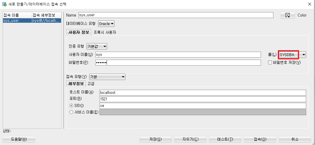 각각의 필드를 알맞게 채운 뒤 룰을 SYSDBA로 설정하고 테스트해보고 저장 -> 접속하면 성공적으로 연결이 됩니다.