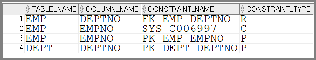 user_cons_columns 스키마와 user_constraints 스키마를 조인하여