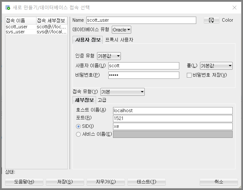 좌측 초록색 + 버튼을 눌러 scott_user 를 추가합니다.