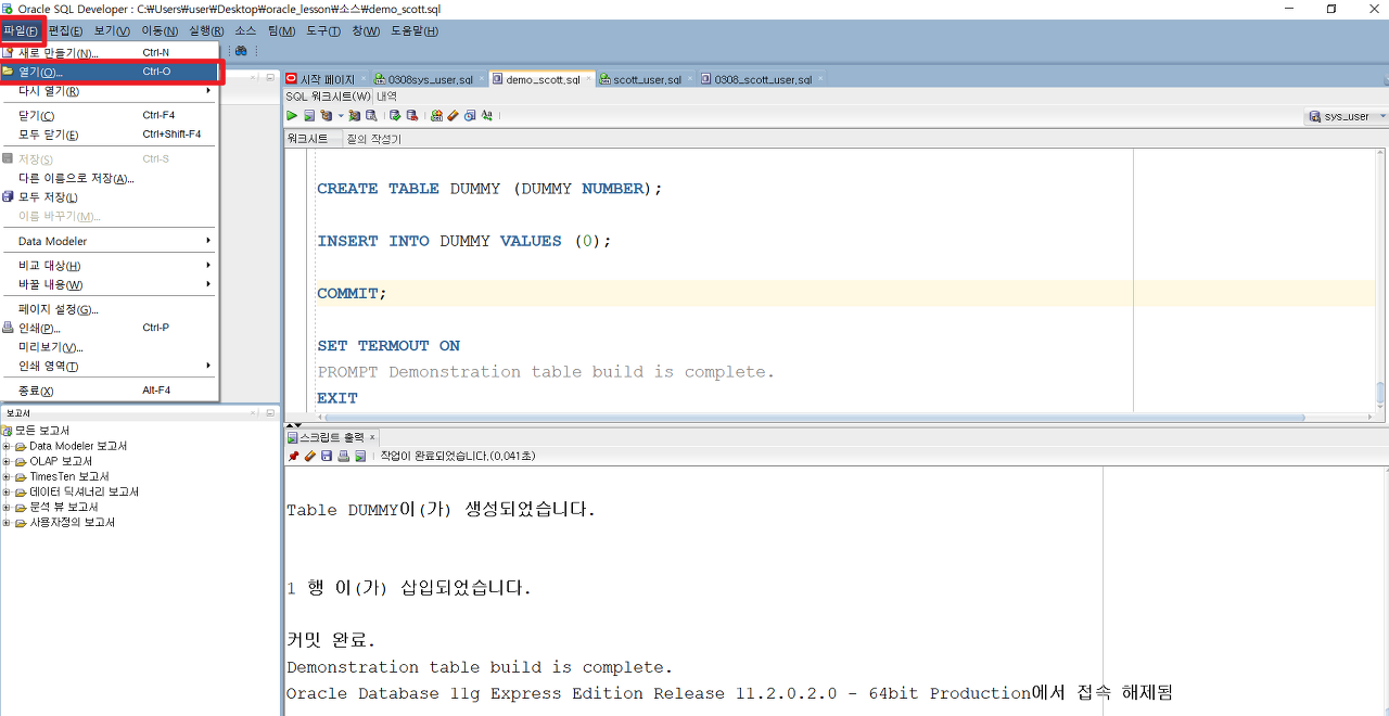 oracle sql developer 에서 파일 > 열기를 이용해 sql 파일을 불러와 줍니다.