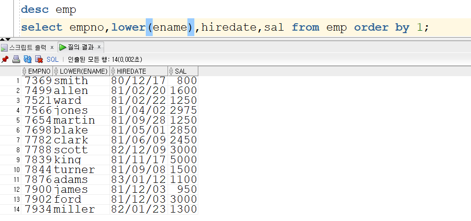 lower함수를 사용하면 출력 값이 대문자인것들을 소문자로 변경하여 출력합니다.