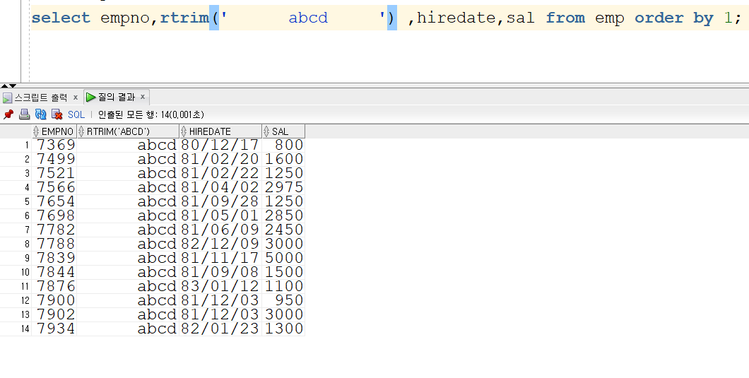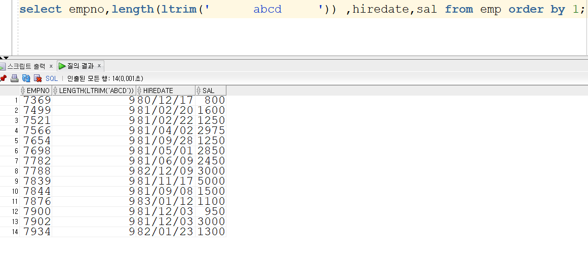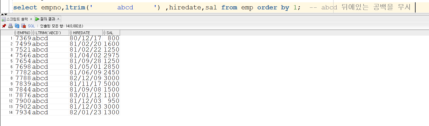 ltrim과 lpad를 비슷하게 볼 수 있겠지만 ltrim은 사진과 같이 공백을 제거를 하는 역할입니다.