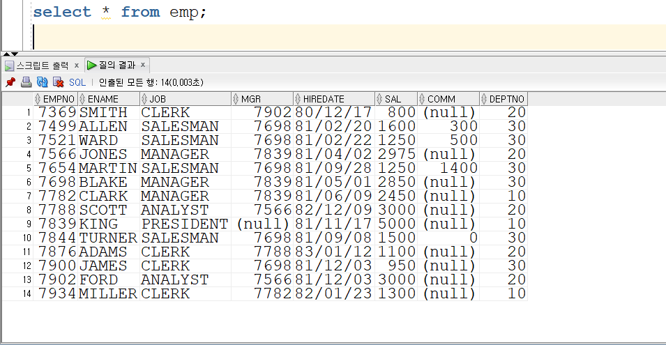 아래는 실습을 위해 사용한 테이블의 구조와 값입니다.