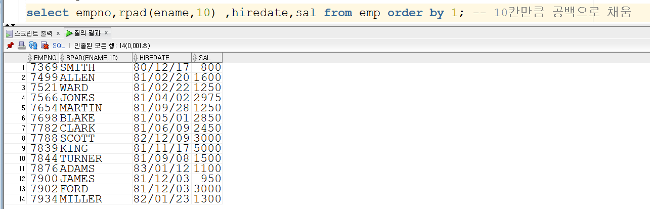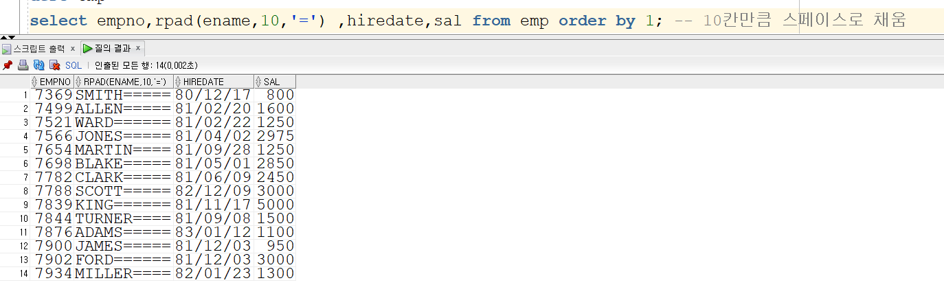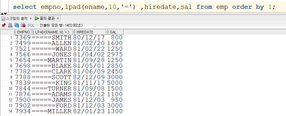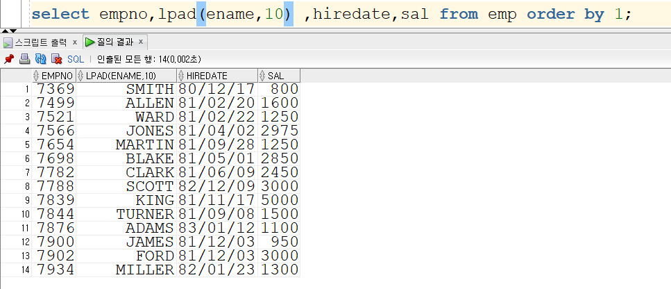 lpad 함수를 사용하면 rpad와 반대로 오른쪽 정렬을 할 수있습니다.