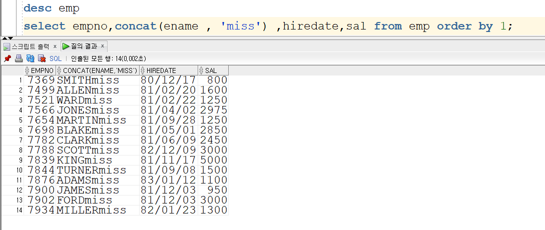 concat 함수를 사용하면 문자 혹은 문자열을 결합을 할 수 있습니다.