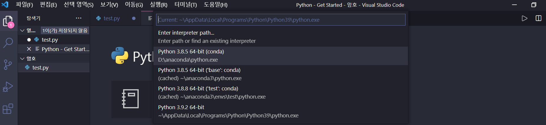 ctrl + shift + p 를 누른 후 Python : Select Interpreter를 찾아서 누릅니다.