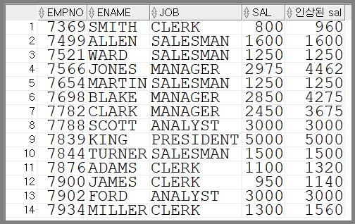 empno, ename, job, sal, 인상된 sal을 출력하세요.