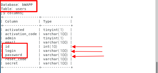 그럼 bWAPP라는 데이터베이스에서 'users'라는 테이블의 총 9개의 칼럼이 출력되었는데요,