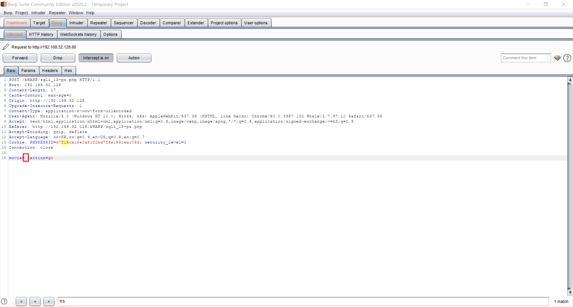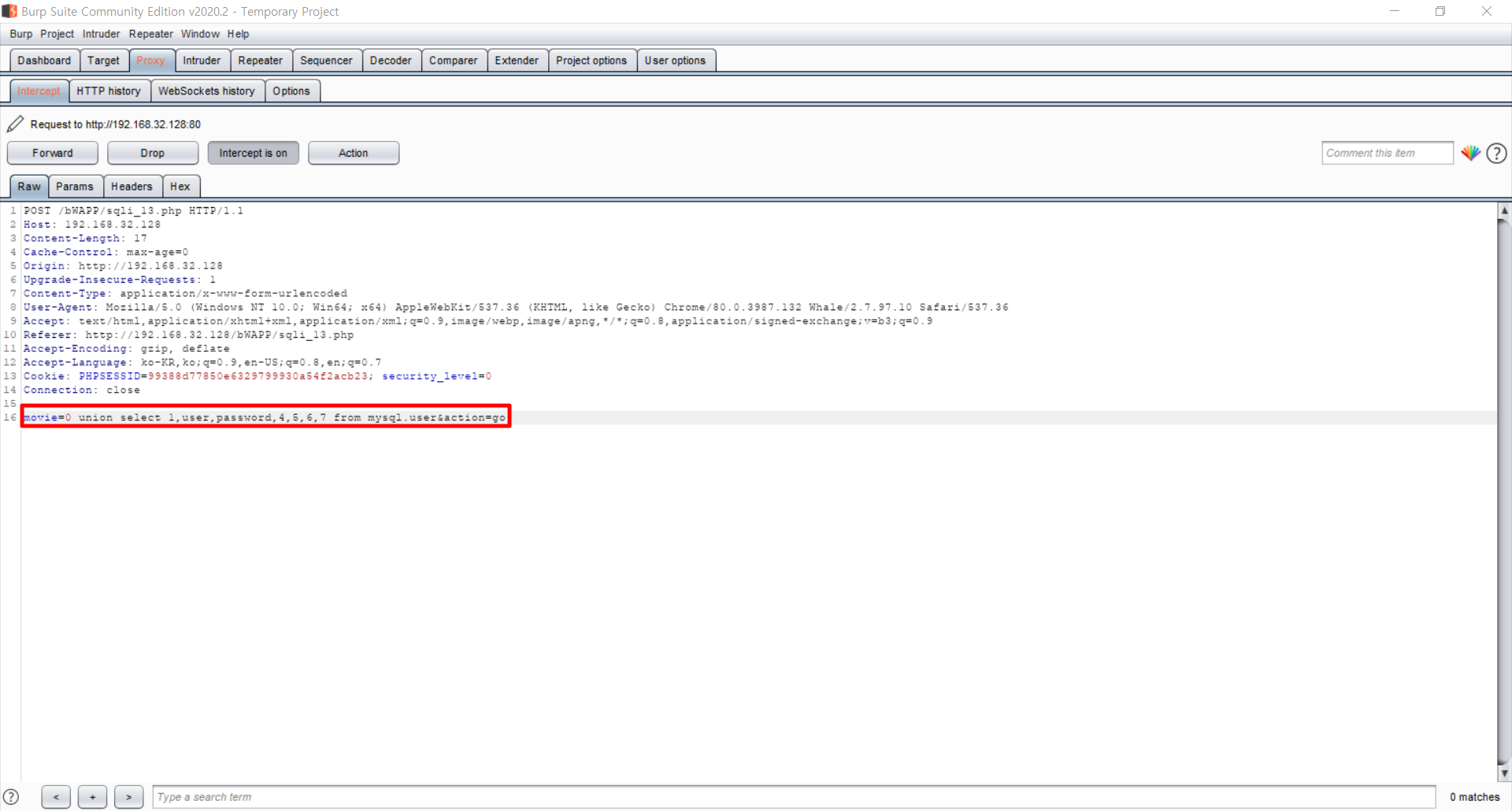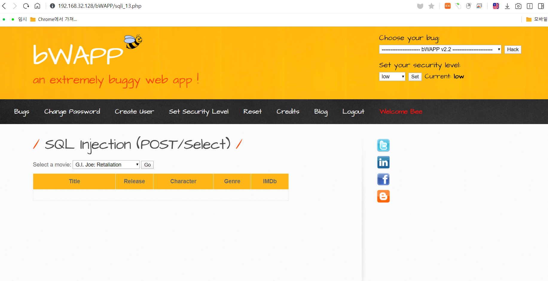 --datab에는 인젝션을 시도할 변수를 적습니다! 또한 bWAPP는 로그인이 되어야 사용 가능하기 때문에