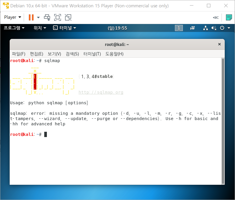 사진 1-12 과같이 칼리 리눅스의 터미널에서 sqlmap을 입력하면 sqlmap의 사용법을 알려줍니다!!.