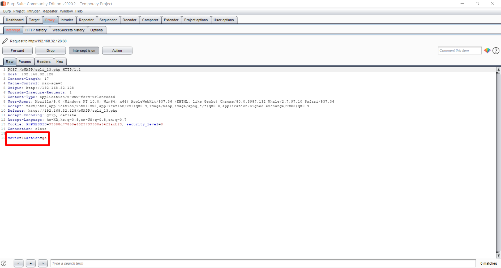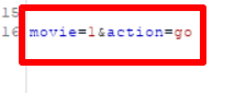 사진 1-3와 사진 1-4와 같이 movie라는 변수가 보이고, movie 변수 안에 쿼리문을 삽입하여 공격을 하겠습니다.