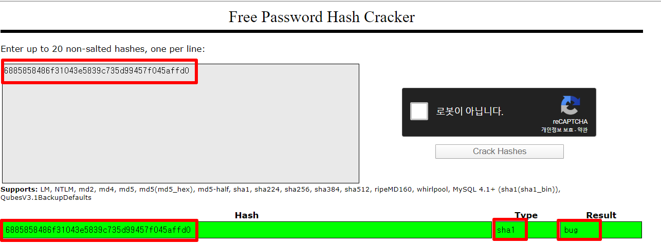sha1의 타입을 쓰고 결과는 'bug'가 나왔습니다!