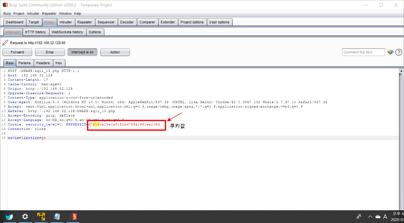 쿠키값을 입력해야 변수에 대한 자동 인젝션 공격이 수행됩니다. 쿠키 값을 관리자 도구 혹은 버프 스위트로 알 수 있습니다!