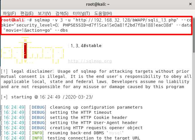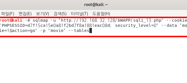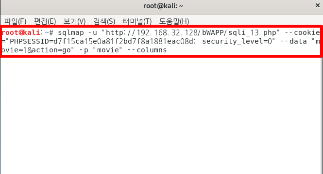 --data 옵션을 사용하여 인젝션 시도할 변수를 명시한다. 또한, 'bWAPP'는 로그인을 해야 사용하기 때문에 유저의