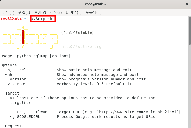 칼리 리눅스의 터미널 창에 sqlmap -u 명령어를 치면 관련된 명령어가 모두 뜨고 그에 대한 설명도 나옵니다!