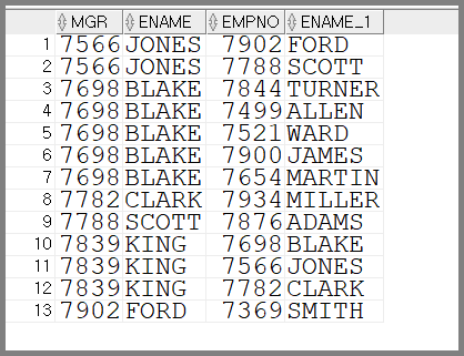 예를 들어서, SMITH 의 매니저는 MGR 컬럼번호 7902를 가지고 있는 FORD 가 될 것입니다.