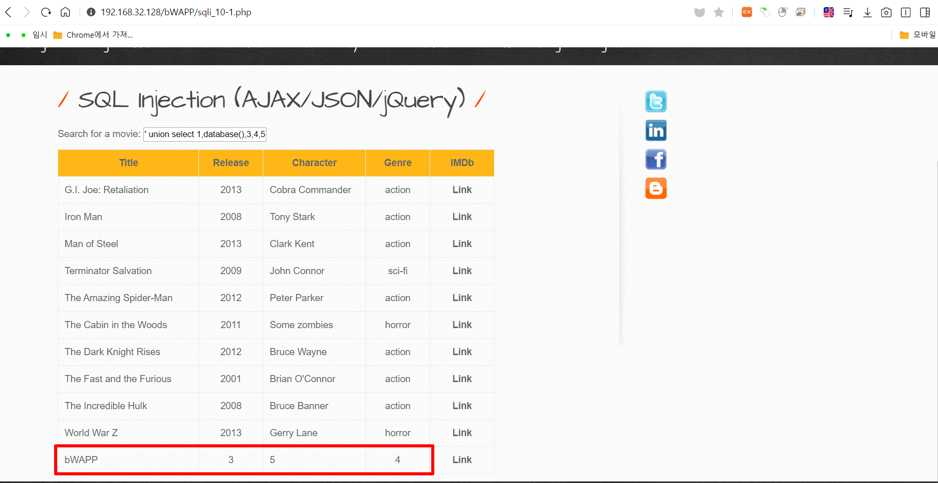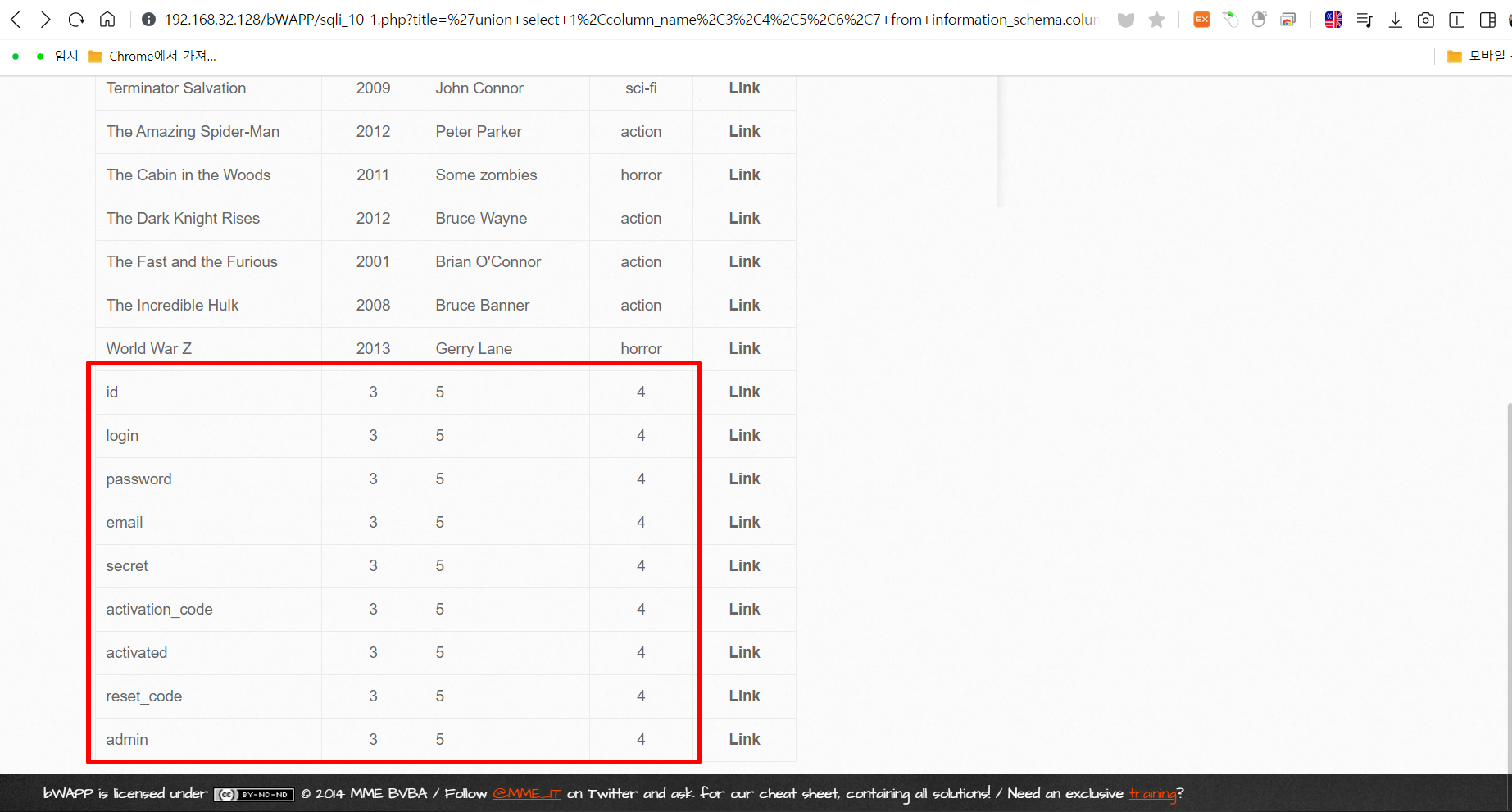 의 쿼리문을 삽입해 데이터베이스 이름이 bWAPP인 db안에 있는 테이블들의 이름을 알아냈습니다!!