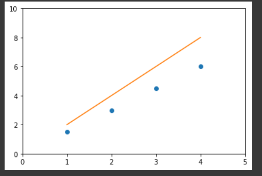 이는 y = x * 2의 가장 단순한 형태의 데이터 배치이며 이때 오차를 최소화하는 직선 모델은 y = x * 2입니다.
