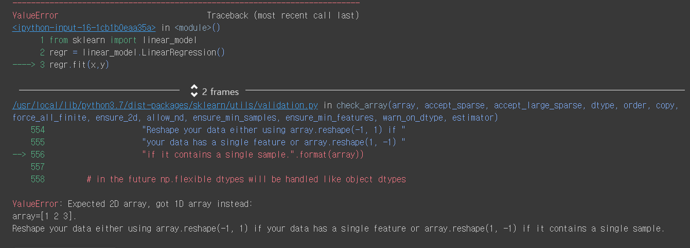 regr.fit(x.reshape(4,1),y) # x와 y 관계의 대해 상관관계로 생성