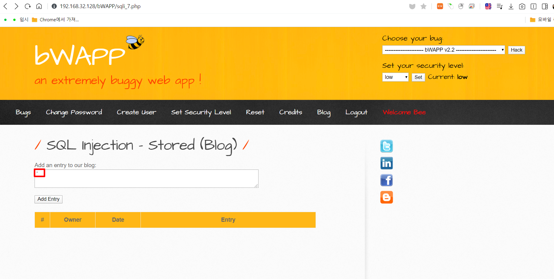 sqli_7.php 페이지는 입력을할수있는 'Add an entry to our blog' 필드가 있습니다