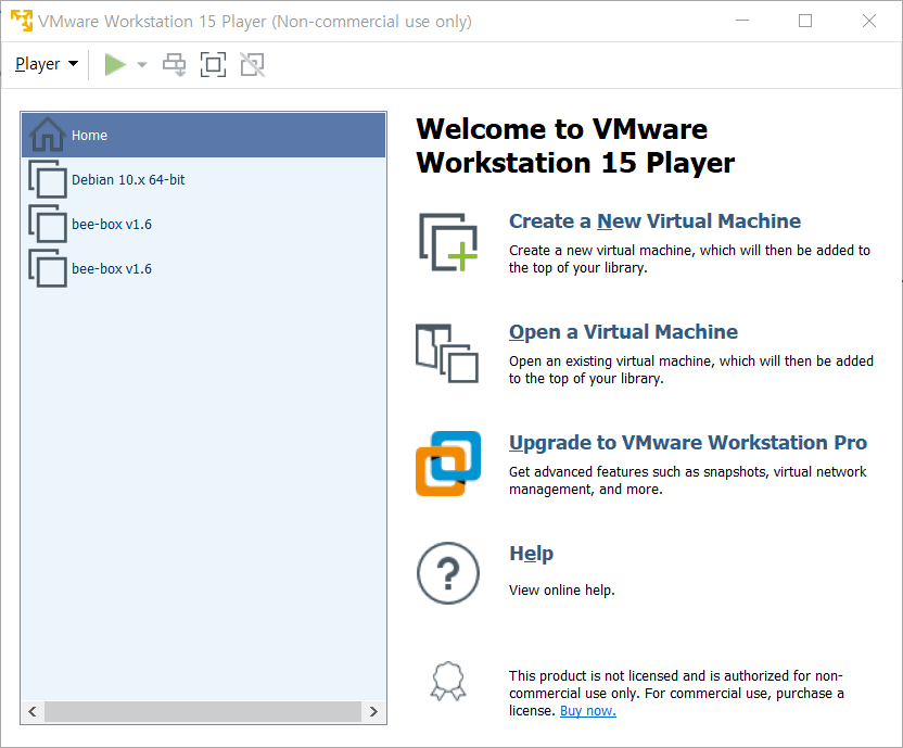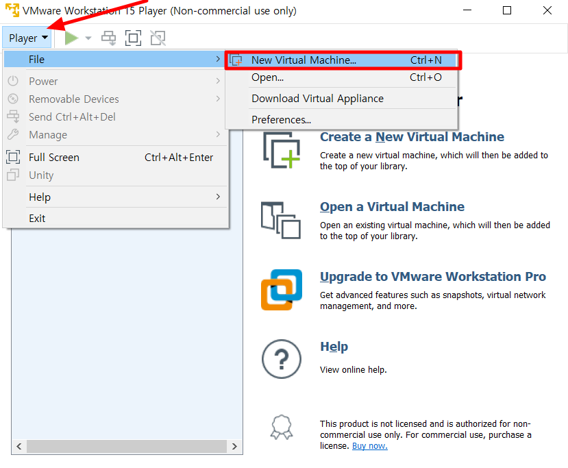 2. 좌측 상단에 Player -> File -> New Virtul Machine 을클릭합니다